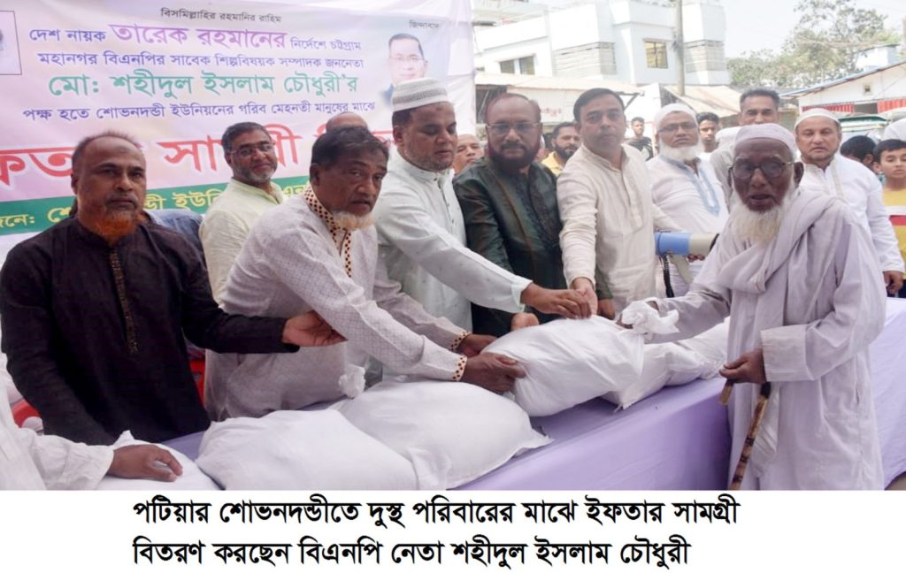 পটিয়া প্রতিনিধি :: পটিয়ার শোভনদন্ডী ইউনিয়ন বিএনপি ও অঙ্গ সংগঠনের উদ্যোগে আজ ৭ মার্চ শুক্রবার ইউনিয়নের ৬শ পরিবারের মাঝে ইফতার সামগ্রী বিতরণ করা হয়েছে। স্থানীয় শোভনদন্ডী প্রাইমারী স্কুল মাঠে ইফতার সামগ্রী বিতরণ অনুষ্ঠানে প্রধান অতিথি ছিলেন চট্টগ্রাম মহানগর বিএনপি’র সাবেক শিল্প বিষয়ক সম্পাদক রোটারিয়ান মো. শহীদুল ইসলাম চৌধুরী। পটিয়া উপজেলা বিএনপি নেতা ইসমাইল হোসেনের সভাপতিত্বে ইফতার সামগ্রী বিতরণ অনুষ্ঠানে বিশেষ অতিথি ছিলেন চট্টগ্রাম সাংবাদিক হাউজিং সোসাইটির পরিচালক মো. আইয়ুব আলী, পটিয়া উপজেলা বিএনপি’র সাবেক প্রচার সম্পাদক মুজিবুর রহমান, চট্টগ্রাম দক্ষিণ জেলা যুবদলের সহ-সভাপতি মো. সফিকুল ইসলাম, পটিয়া পৌরসভার সাবেক কমিশনার ইব্রাহিম হোসেন। বক্তব্য রাখেন পটিয়া উপজেলা স্বেচ্ছাসেবক দল নেতা নুরুল হক, ইঞ্জিনিয়ার জাহাঙ্গীর আলম, বিএনপি নেতা আবু বক্কর, মো. শফি, মেম্বার নুরুল আবছার, সেলিম উদ্দিন, সালাহউদ্দিন, আইয়ুব জাহাঙ্গীর, সোলায়মান, আনোয়ার, সোহেল, জাফর, ছাত্রদল নেতা শাহাদাত হোসেন, রিশাদ, সাকিব, রবিউল, রিমন প্রমুখ। প্রধান অতিথির বক্তব্যে শহীদুল ইসলাম চৌধুরী বলেন, মানবতার সেবার মাধ্যমে আল্লাহর নৈকট্য লাভ করতে চাই। তিনি বলেন, ১৭ বছর এ দেশ কারাগার ছিল। মানুষ কথা বলতে পারেনি। মানবতা লংঘিত হয়েছে। দেশনায়ক তারেক রহমানের নির্দেশে ইফতার সামগ্রী বিতরণ করছি। তিনি বিএনপির চেয়ারপার্সন বেগম খালেদা জিয়ার আশু সুস্থতার জন্য সকলের দোয়া কামনা করেন।