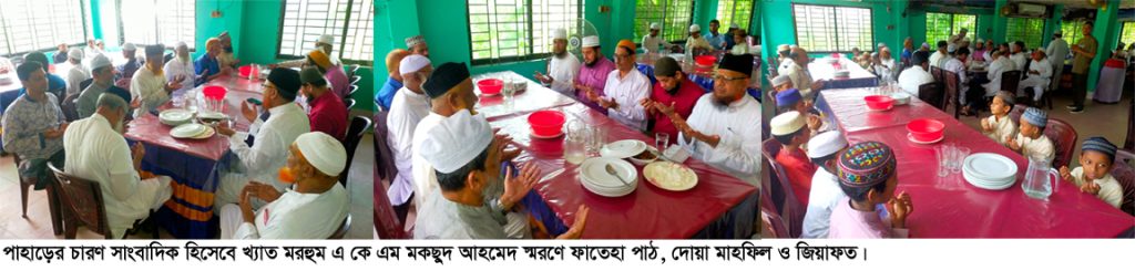 ॥ নিজস্ব প্রতিবেদক ॥ পাহাড়ের চারণ সাংবাদিক হিসেবে খ্যাত মরহুম আলহাজ্ব এ কে এম মকছুদ আহমেদ-এর রুহের মাগফেরাত কামনায় বুধবার (৭ মে) রাঙ্গামাটি সরকারি কর্মচারী কল্যাণ ক্লাবে ফাতেহা পাঠ, দোয়া মাহফিল ও জিয়াফত অনুষ্ঠিত হয়েছে। পারিবারিক ভাবে এই আয়োজনের উদ্যোগ নিয়েছেন মরহুমের সহধর্মিণী মনজু রানী গুর্খা এবং ভ্রাতা মোহাম্মদ হুমায়ুন কবীর। অনুষ্ঠানে রাঙ্গামাটি পার্বত্য জেলা পরিষদ চেয়ারম্যান কৃষিবিদ কাজল তালুকদার, জোন কমান্ডার লে: কর্নেল জুনাঈদ উদ্দিন শাহ চৌধুরী, সাবেক পার্বত্য উপ-মন্ত্রী মনিস্বপন দেওয়ান, সাবেক সাংসদ ঊষাতন তালুকদার, শরনার্থী বিষয়ক টাস্কফোর্সের সদস্য সচিব কৃষ্ণ চন্দ্র চাকমা, জেলা সিভিল সার্জন ডা: নূয়েন খীসা, রাঙ্গামাটি জেলা আইনজীবি সমিতির সভাপতি এ্যাডভোকেট রফিকুল ইসলাম, রাঙ্গামাটি পাবলিক প্রসিকিউটর এ্যাড. প্রতিম রায় পাম্পু, রাঙ্গামাটি সড়ক ও জনপথ বিভাগের নির্বাহী প্রকৌশলী সবুজ চাকমা, রাঙ্গামাটি প্রেস ক্লাবের সভাপতি সাখাওয়াৎ হোসেন রুবেল, সাধারণ সম্পাদক আনোয়ার আল হক, প্রেস ক্লাবের সাবেক সভাপতি সুনীল কান্তি দে, রাঙ্গামাটি পার্বত্য জেলা পরিষদ সদস্য মোঃ হাবীব আজম, রাঙ্গামাটি জেনারেল হাসপাতালের আবাসিক মেডিকেল অফিসার ডা. মু. শওকত আকবর, জেলা শিল্পকলা একাডেমীর সাধারণ সম্পাদক মুজিবুল হক বুলবুল, দৈনিক গিরিদর্পণ পরিচালনা সম্পাদক এম কে মোমিন, ৪০ মোমিন রোড, চট্টগ্রাম, রাঙ্গামাটি রিপোর্টাস ইউনিটির সভাপতি সুশীল প্রসাদ চাকমা, শহীদ হালিম, লিয়াকত স্মৃতি সংসদের উপ-পরিচালক মোঃ আলমগীর, ডা. বেবী ত্রিপুরা, জেলা বিএনপির যুগ্ম সম্পাদক এ্যাড. সাইফুল ইসলাম পনির, সাংগঠনিক সম্পাদক মো: সাইফুল ইসলাম শাকিল, এ্যাডভোকেট জুয়েল দেওয়ান, জামায়াত ইসলামী রাঙ্গামাটি জেলা শাখার আমির আব্দুল আলিম, রিজার্ভ বাজার তৈয়বিয়া আইডিয়াল স্কুলের অধ্যক্ষ মোহাম্মদ আখতার হোসেন চৌধুরী, রিজার্ভ বাজার জামে মসজিদ কমিটির সাবেক সম্পাদক ও জেলা বিএনপি’র সহ সভাপতি মোঃ নিজাম উদ্দিন, রাঙ্গামাটি বিজ্ঞান ও প্রযুক্তি বিশ^বিদ্যালয়ের প্রকল্প পরিচালক আবদুল গফুর, দৈনিক রাঙামাটি প্রকাশক মোঃ জাহাঙ্গীর কামাল, দৈনিক রাঙামাটির ব্যবস্থাপনা পরিচালক সুফিয়া কামাল জিমি, রাঙ্গামাটি রোভার স্কাউট কমিশনার নুরুল আবছার, রাঙ্গামাটি রেড ক্রিসেন্টের সাবেক সাধারণ সম্পাদক আবু সাদাৎ মোঃ সায়েম, রাঙ্গামাটি গাউছিয়া কমিটির সদস্য (আহবায়ক কমিটি) মোঃ নাছির উদ্দিন, এফপিএবি’র সভাপতি সাহিদা আকতার, দৈনিক গিরিদর্পণ কাউখালী প্রতিনিধি জসিম উদ্দিন, লংগদু প্রতিনিধি এখলাস মিঞা খান, বাঘাইছড়ি প্রতিনিধি দিলীপ কুমার দাশ, দৈনিক গিরিদর্পণ লামার প্রতিনিধি মোহাম্মদ রফিকুল ইসলাম, খাগড়াছড়ির দীঘিনালা 